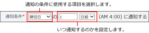 通知する期日を、通知の条件に指定した項目の何日前、または何日後で指定します。初期値は「日前」です。