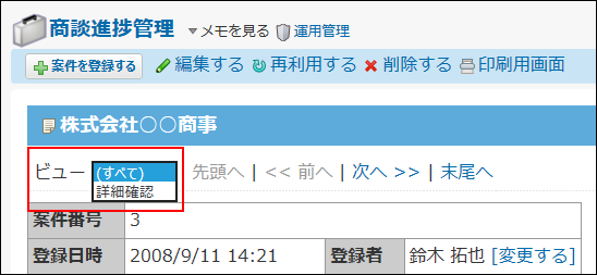 レコードの次の画面の見せかた(ビュー)を切り替えます。各ビューで表示する項目や書式は、アプリの運用管理者によって設定されています。