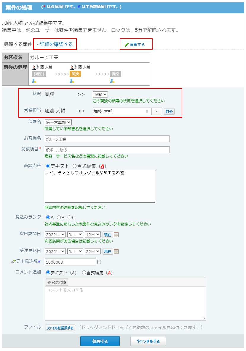 :選択した処理状況と同じステータスと処理者が、入力欄の状況項目と処理者項目に反映されます。