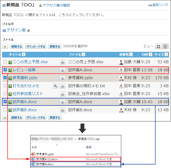 ダウンロードするファイルは、zipファイル形式でまとめられます。zipファイルの名前には、ファイルが保存されているフォルダ名が自動的に設定されます。