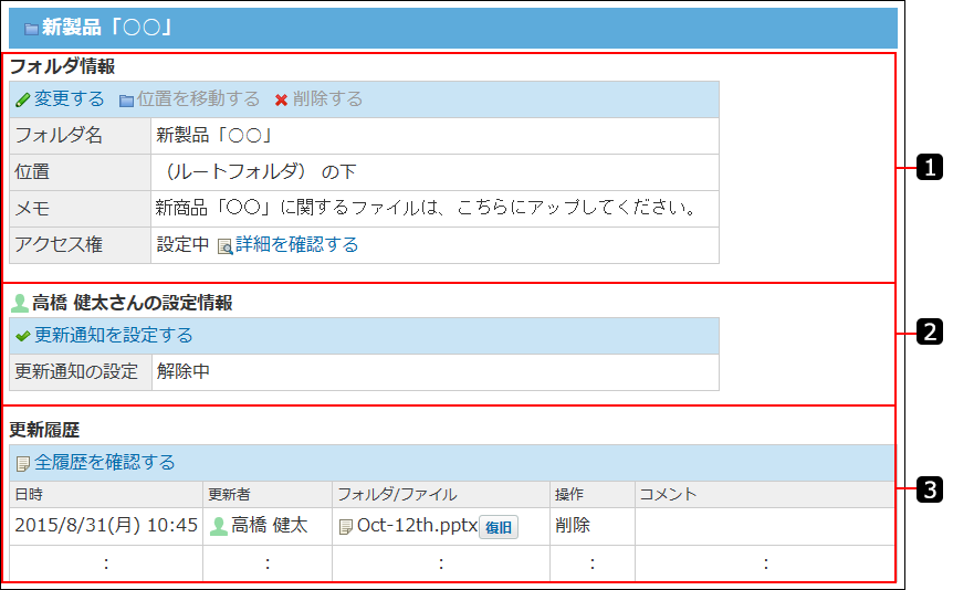 フォルダの作成や位置の移動など、フォルダの更新履歴が表示されます。 |