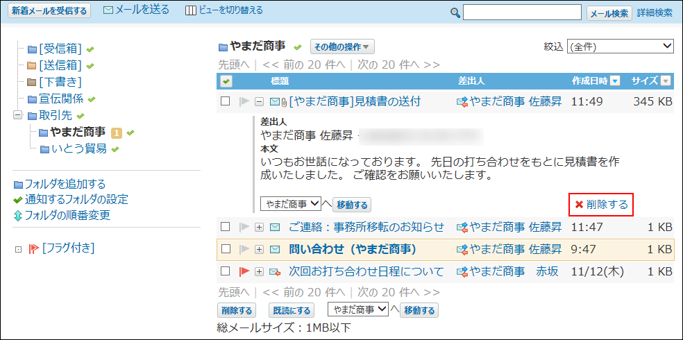 プレビューや概要を確認して、1件ずつメールを削除します。
