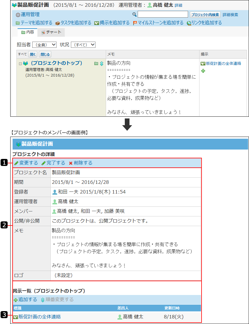 [変更する]、[完了する]、[削除する]のリンク: プロジェクトの運用管理者とプロジェクトの登録者の画面にのみ表示されるリンクです。 プロジェクトの設定内容の変更や削除、プロジェクトのステータス変更ができます。 |