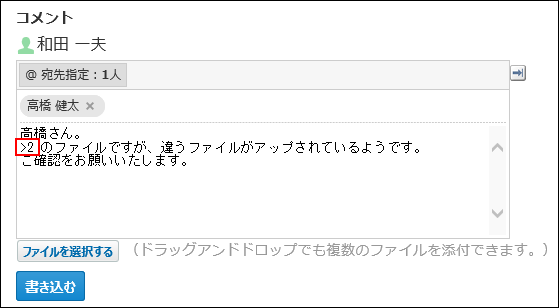 @>コメント番号の宛先を指定するクリックすると、返信元のコメントで宛先に指定されているすべてのユーザーを宛先に指定できます。