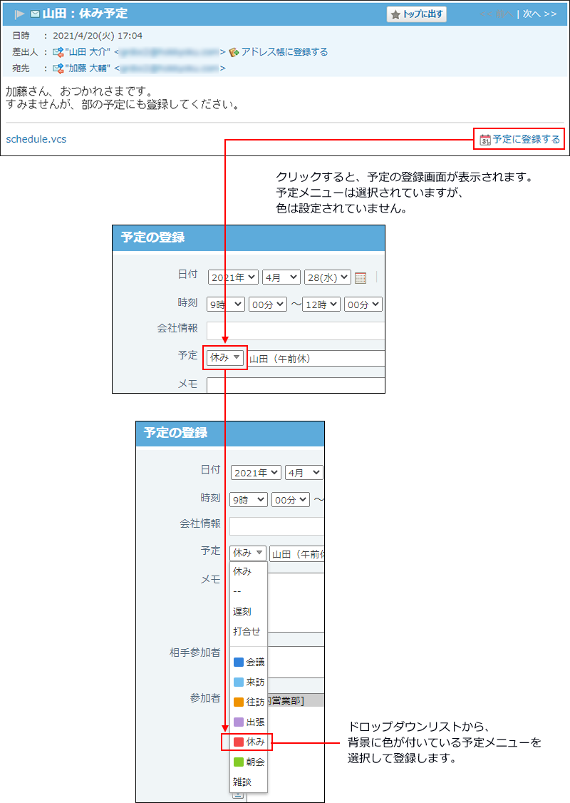 予定の登録情報が添付されたメールの詳細画面を表示します。