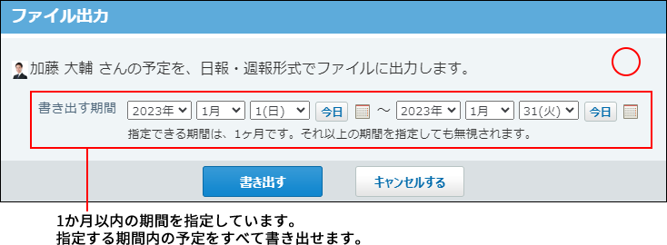 指定できる期間は最大で1か月です。1か月以上の期間を指定した場合、開始日から1か月までの予定が書き出されます。