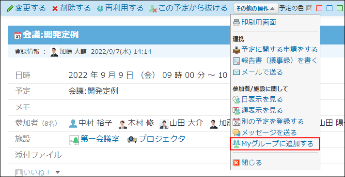 予定に設定されている参加者や施設をMyグループとして登録できます。