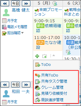 予定の一覧で、カスタムアプリのレコードを確認したり、登録したりできます。
