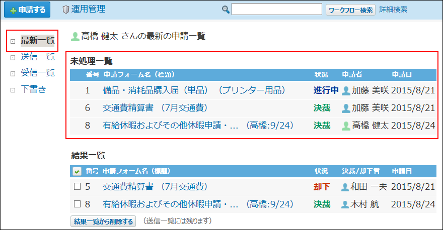 「最新一覧」画面で、「未処理一覧」セクションの申請データを確認します。