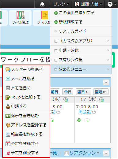始めるメニューは、予定の登録や掲示の書き込みなど、よく使うアプリケーションでのスタートアクションをまとめたメニューです。