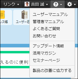 ヘルプアイコン: マニュアルやよくあるご質問など、サイボウズ Officeを使っていて困ったときに役立つメニューが表示されます。 次のメニューは、システム管理者のみに表示されます。