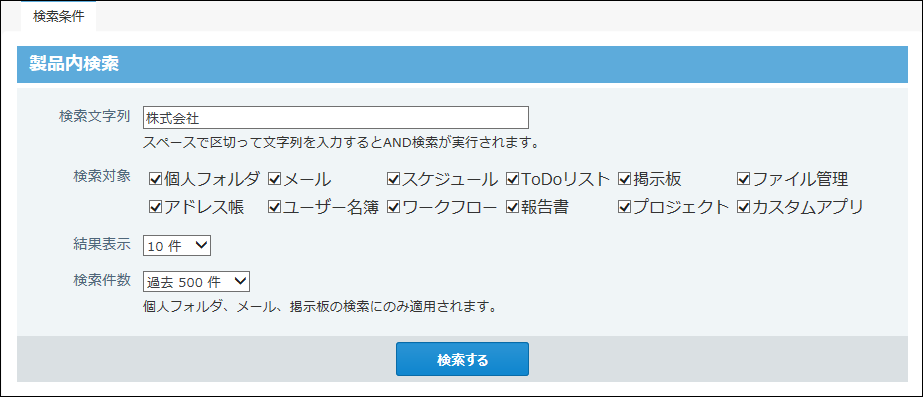 AND検索する場合は、文字列と文字列の間に半角または全角のスペースを入力します。検索対象 検索するアプリケーションを選択します。 結果表示 検索結果に表示する件数をドロップダウンリストから選択します。 検索件数 過去何件のデータから検索するのかを、ドロップダウンリストから選択します。