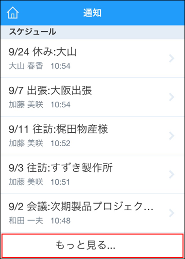 ひとつのアプリケーションにつき、5件まで表示されます。6件以上通知が存在する場合は、[もっと見る]をタップすると、6件以上の通知が表示されます。