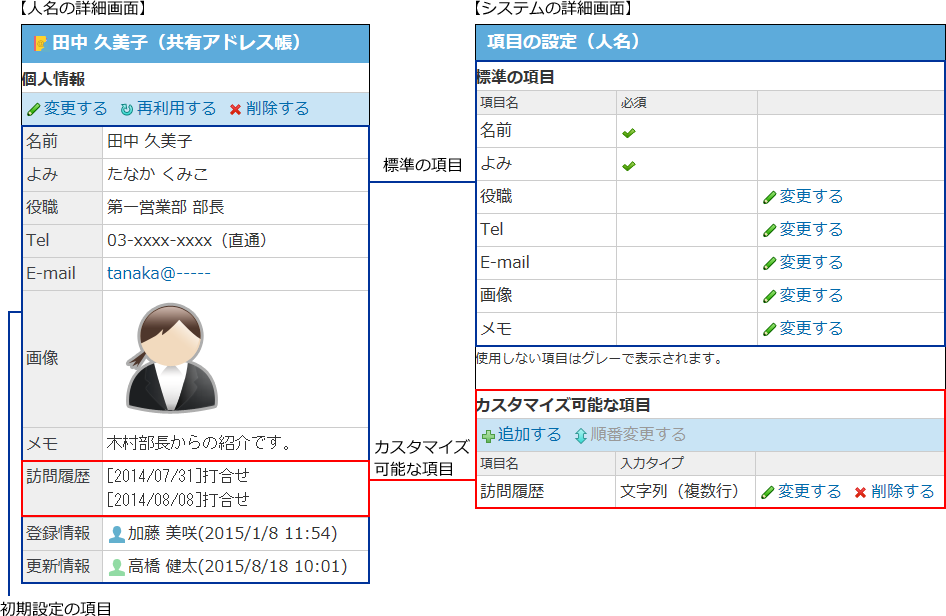 訪問履歴や担当業務など、必要な項目を人名の項目に追加できます。