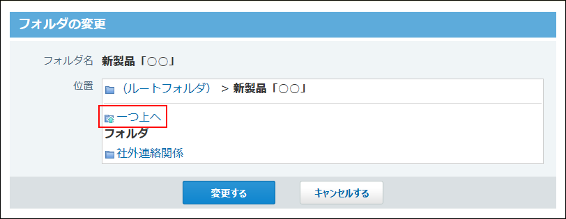 一つ上へをクリックすると、現在選択しているフォルダのひとつ上の階層のフォルダが表示されます。