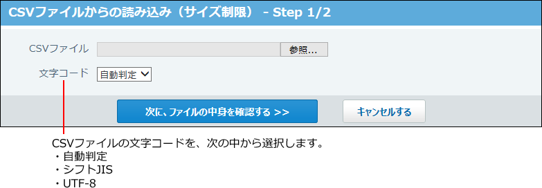 CSVファイルの文字コードを、ドロップダウンリストから選択します。