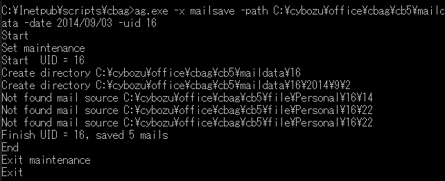 ag.exe -x mailsave -path (保存フォルダの絶対パス) -date (yyyy/mm/dd) -uid (対象ユーザーID) -e (実行時間(秒))ユーザーIDが445のユーザーのメールデータをすべてC:\mailbackupに保存する場合の入力例: