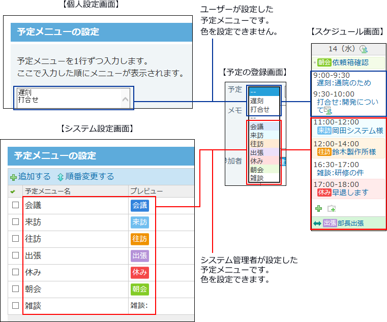 システム管理者が設定した予定メニューにのみ、色を指定できます。
