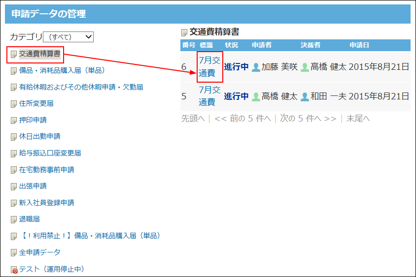 申請フォームを選択し、経路を変更する申請データの標題をクリックします。