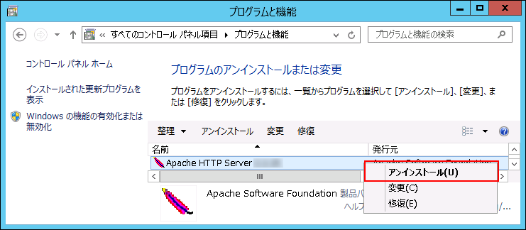 「Apache HTTP Server 2.x.x」を右クリックし、「アンインストール」をクリックします。