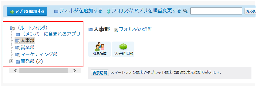 フォルダツリーで、アプリの作成先のフォルダを選択します。