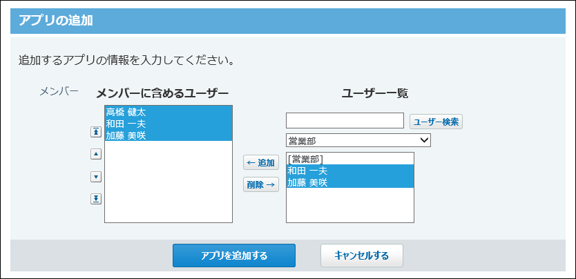 ステータス管理機能を使用しているアプリを追加する場合はメンバーを設定し、アプリを追加するをクリックします。