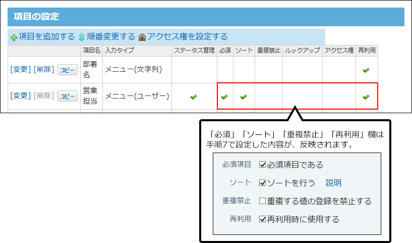 「項目の設定」画面で、追加した項目の設定を確認します。