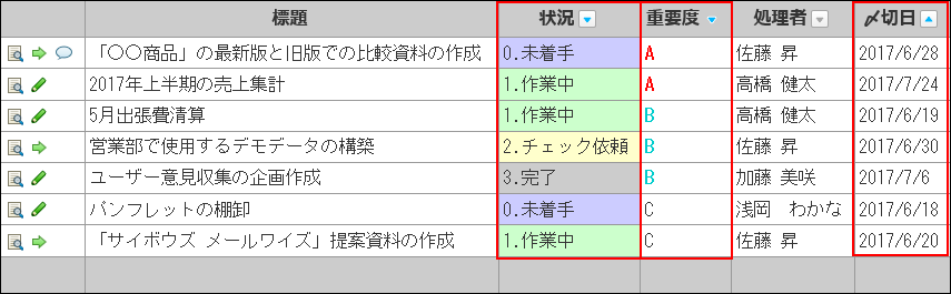 - 例: 「重要度」、「〆切日」、「状況」項目を組み合わせたソート