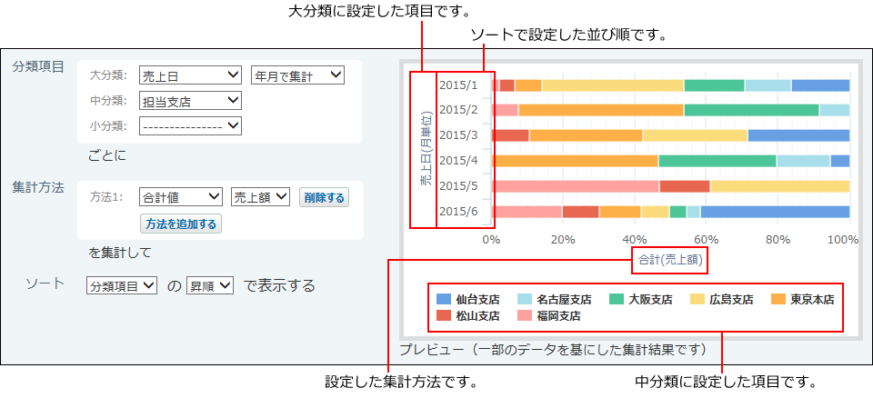 ここでは、月ごとの売上のうち、各支店の占める割合を横棒グラフ(100%積み上げ)にする場合を例に説明します。