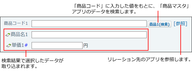 「見積り依頼受付」アプリの「商品コード」と「商品マスタ」アプリの「商品コード」をキーにする場合