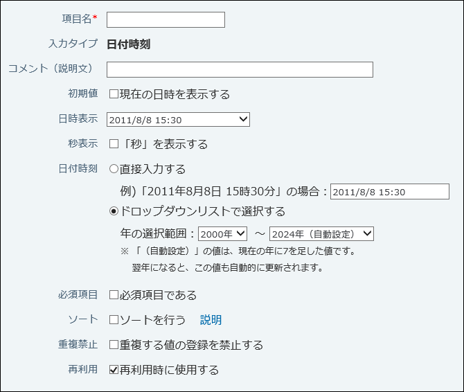 | 初期値 | 現在の日時を初期値として設定する場合は、「現在の日時を表示する」を選択します。 レコード登録画面を開くと、初期値が項目に入力された状態で表示されます。 |