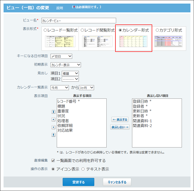 | 直接編集 | 一覧画面でレコード内容を直接編集できるようにする場合に選択します。 カレンダー一覧表示の場合のみ有効です。 利用を許可していても、スマートフォン端末やタブレット端末向けの画面では、直接編集を利用できません。 |