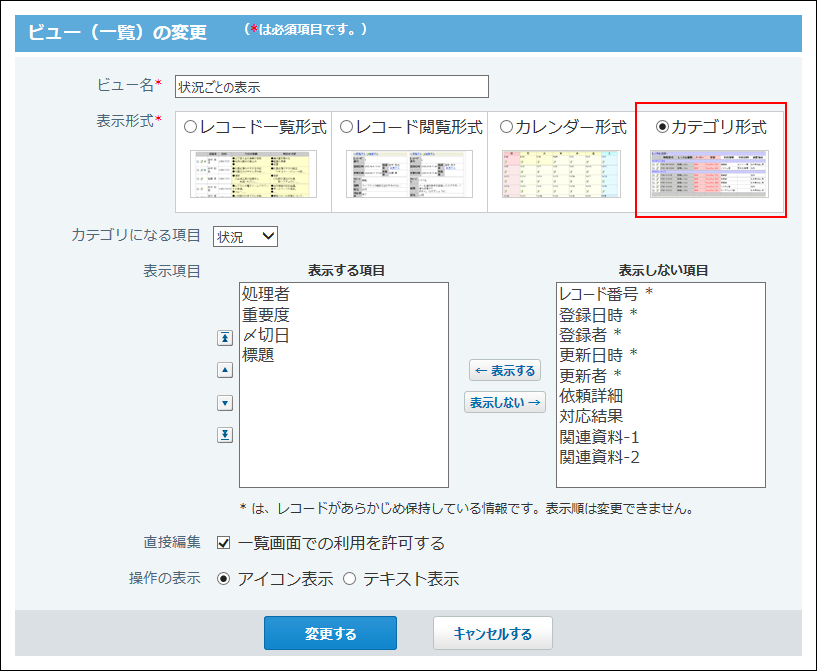 ビュー(一覧)の表示形式に、「レコード一覧形式」、「カレンダー形式」、「カテゴリ形式」のいずれかを選択している場合は、レコードの操作(閲覧、編集、処理、コメント)を示す部分を、アイコンで表示するか、テキストで表示するか設定できます。