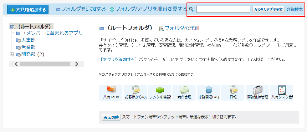 ここでは、カスタムアプリの画面から検索する方法を説明します。