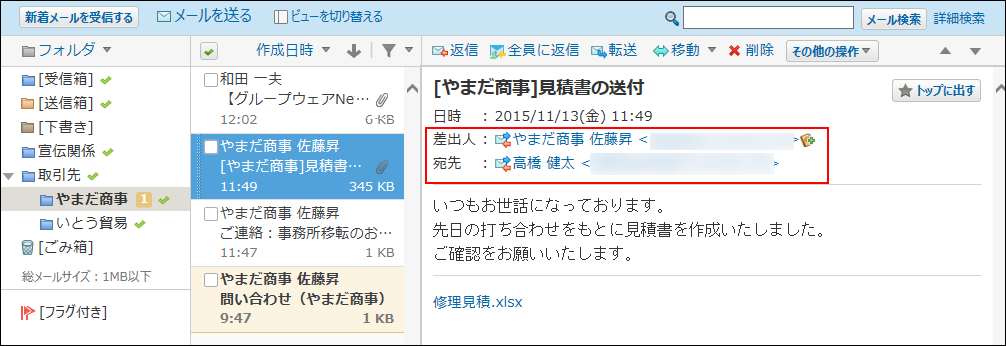 - メール一覧で、送受信履歴を確認するメールを選択します。