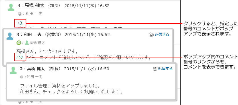@>コメント番号の宛先を指定するクリックすると、返信元のコメントで宛先に指定されているすべてのユーザーを宛先に指定できます。