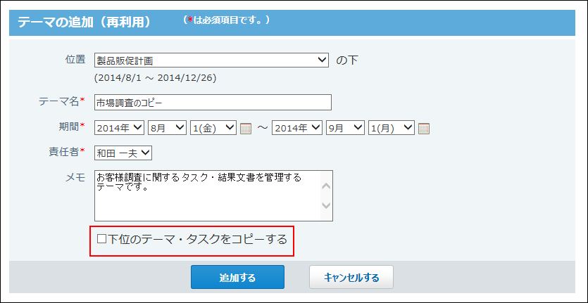 再利用するテーマの配下に設定されているテーマやタスクを併せて再利用する場合は、「下位のテーマ・タスクをコピーする」を選択します。