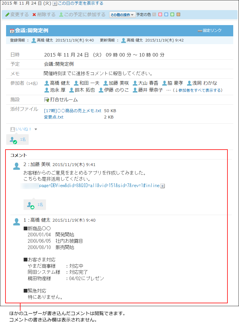 予定の変更を許可されていないユーザーは、予定の本文や、ほかのユーザーが書き込んだコメントの、閲覧のみ可能です。