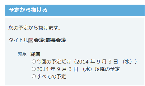 予定から抜けると、参加者に更新情報が通知されます。予定から抜けた本人に更新情報は通知されません。