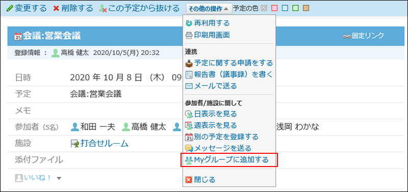 予定に設定されている参加者や施設をMyグループとして登録できます。