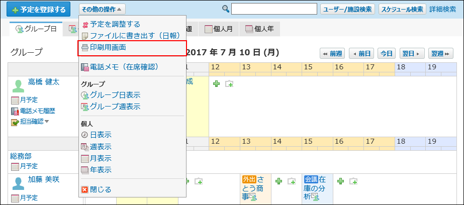 グループ週表示画面で予定を印刷します。