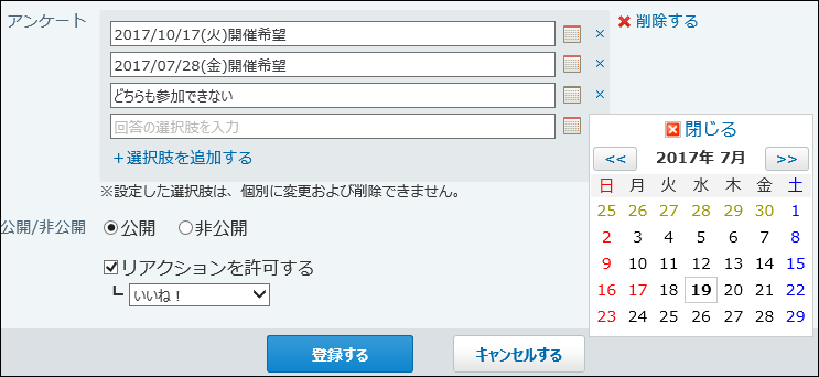 | リアクションを許可する | 予定やコメントに対する、「いいね!」や「確認しました」などのリンクを使った、ユーザーの意思表示を許可するかどうかを設定します。 |