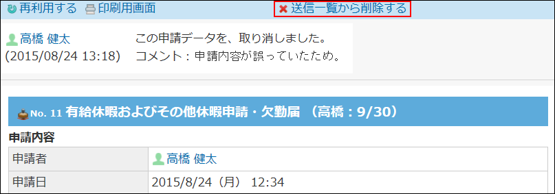 「送信一覧」で削除できるのは、処理状況が、「取消」、「完了」、および「却下」の申請です。