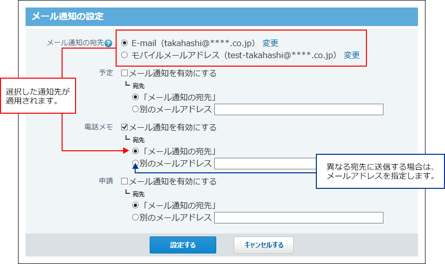 「メール通知を有効にする」を選択し、転送先を指定し、設定するをクリックします。