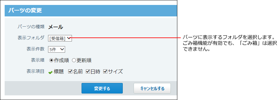 「メール」パーツは、指定したフォルダに格納されているメールを一覧で確認できます。