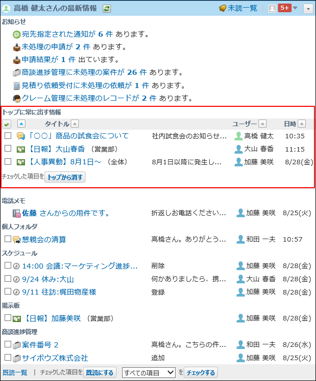 表示位置: トップに常に出す情報を表示する位置を設定します。 「トップに常に出す情報」を新着通知の下に表示する設定にした場合の例: ![]() 「トップに常に出す情報」を新着通知の下に表示しない設定にした場合の例: ![]() |